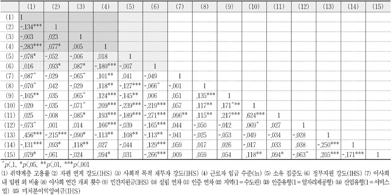 조직의 공공성을 연구하기 위해서는 경영진 등 내부 요소와 조직 외부의 요소를 통제할 필요가 있다(Andrews et al., 2011). 이에 내부 요소로서 의사결정구조와 관련 있는 이사회 내 임원 외 비율과 이사회 개최 횟수를, 외부 요소로서 민간지원금을 통제변수에 포함하였다. 사회적기업의 특성 요인으로 연력(설립 연차 및 인증 연차), 소재지, 인증유형, 산업유형, 미처분이익잉여금을 통제변수로 고려하였다.