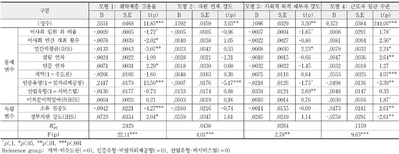 사회적기업의 공공성이 사회적 성과에 미치는 효과를 살펴보기 위해, 사회적 성과인 취약계층 고용률, 자원 연계 강도, 사회적 목적 재투자 강도와 근로자 임금 수준을 각각 종속변수로, 공공성의 요소인 소유 집중도와 정부지원 강도를 독립변수로 설정한 뒤 통제변수를 포함하여 다중회귀분석을 실시하였다. 모든 모형에서 분산팽창지수(VIF)는 1.8 미만으로, 다중공선성 유무의 기준값인 5 미만으로 나타나 다중공선성의 문제는 없는 것으로 판단된다(Shrestha, 2020).