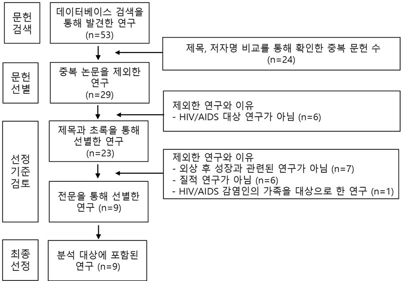 본 연구는 HIV/AIDS 감염인의 외상 후 성장(Post-Traumatic Growth, PTG)을 통합적으로 이해하기 위해 국외 질적 연구를 질적 메타요약 방법으로 분석하였다. 2025년 10월까지 발표된 관련 질적 연구 9편을 선정하고, CASP를 활용하여 연구의 질을 평가하였다....